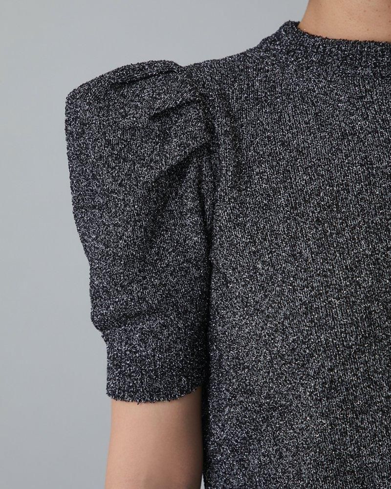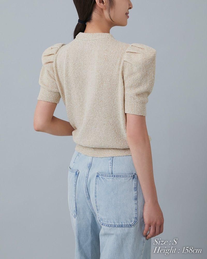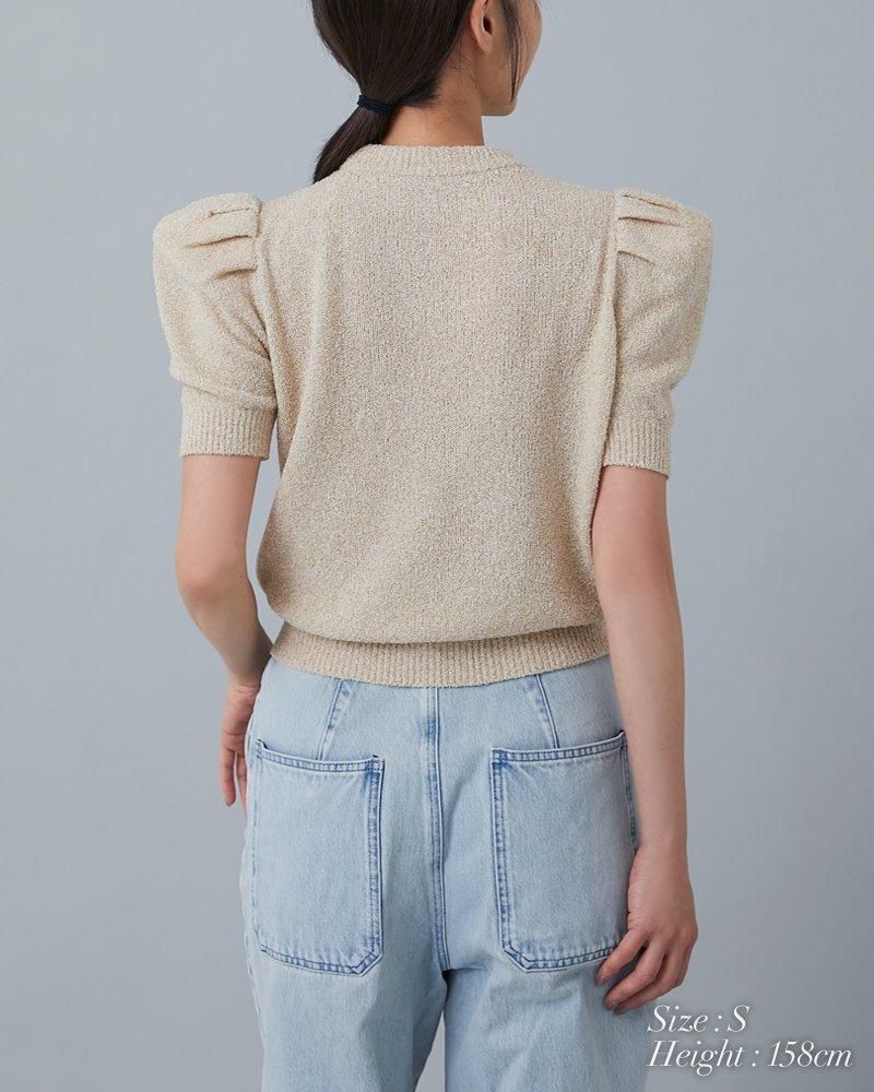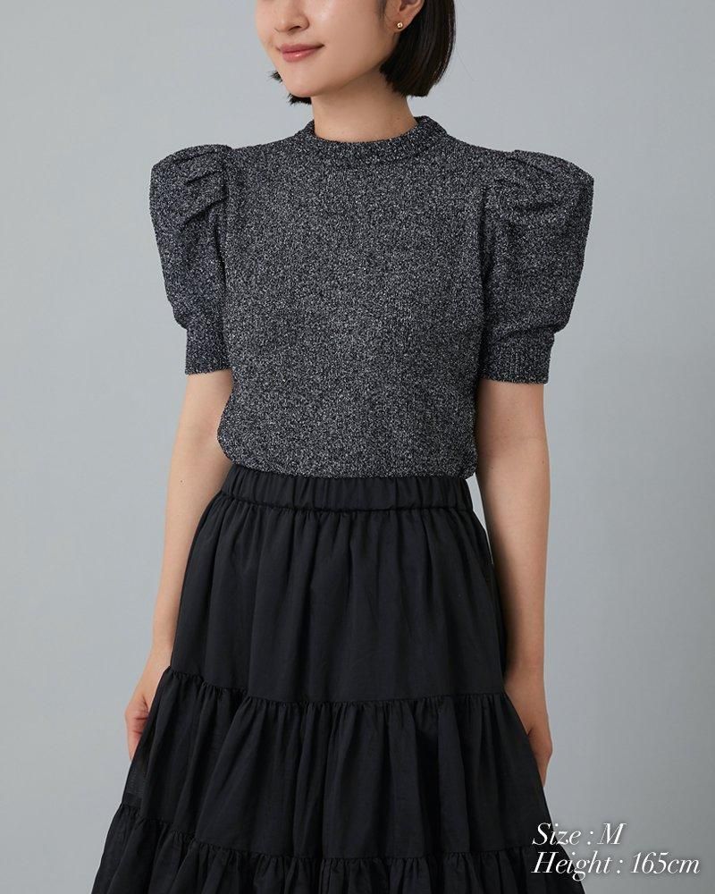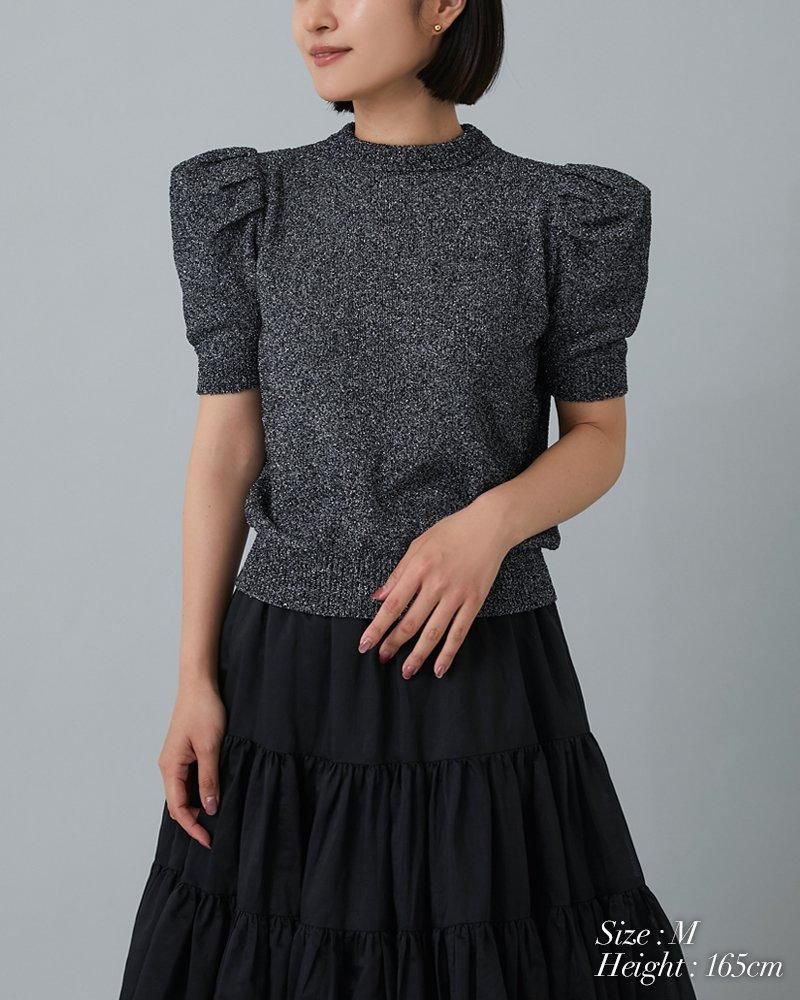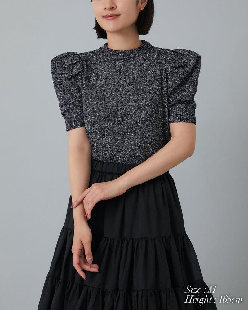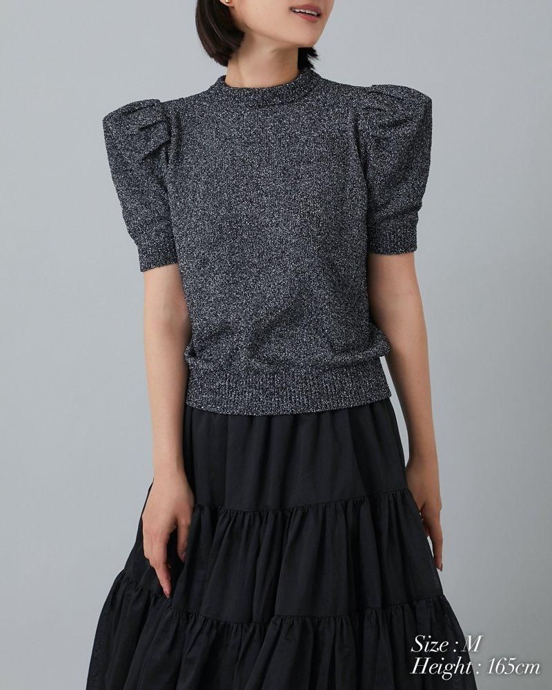 モード感のある立体的な袖とさりげないラメが品良く調和する絶妙なバランス感。