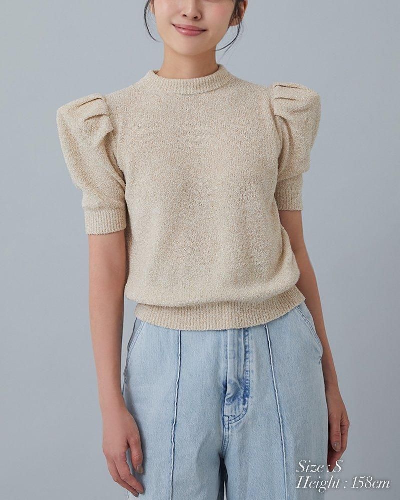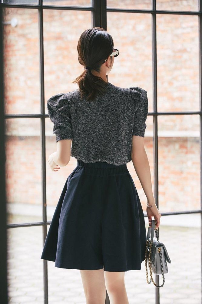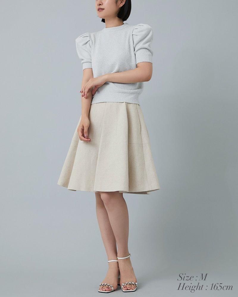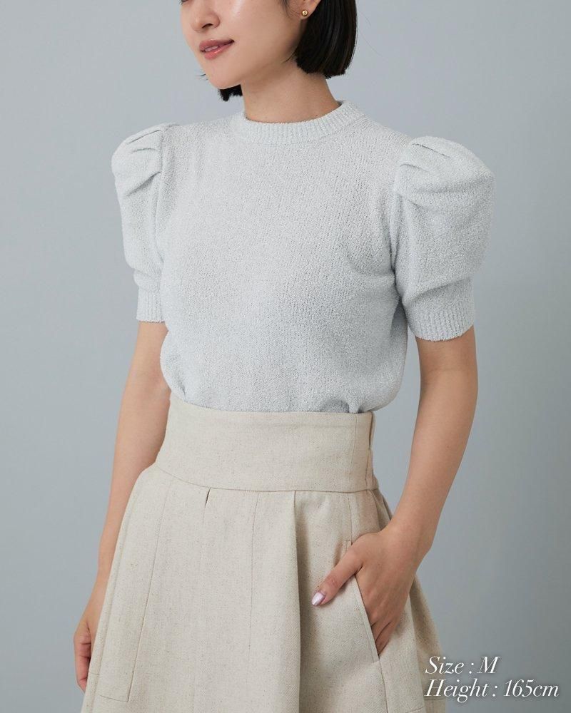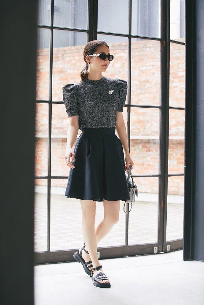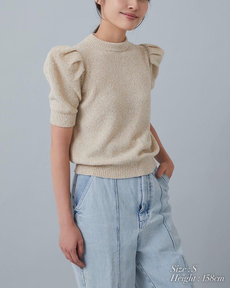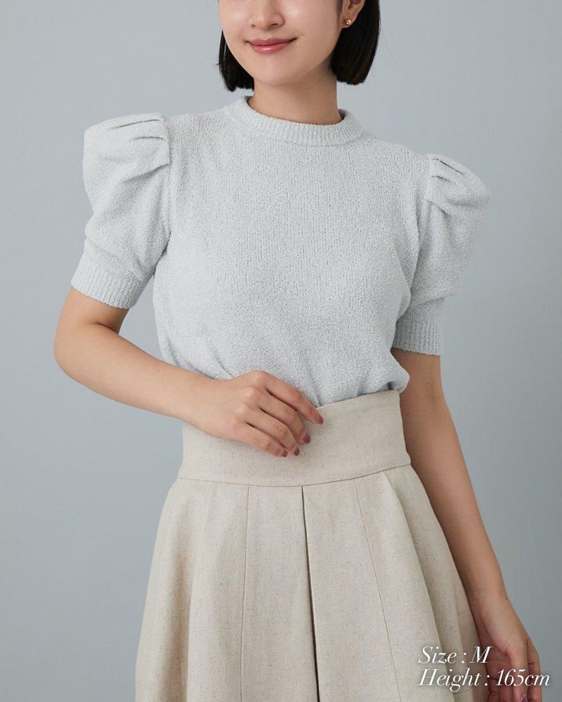 モード感のある立体的な袖とさりげないラメが品良く調和する絶妙なバランス感。