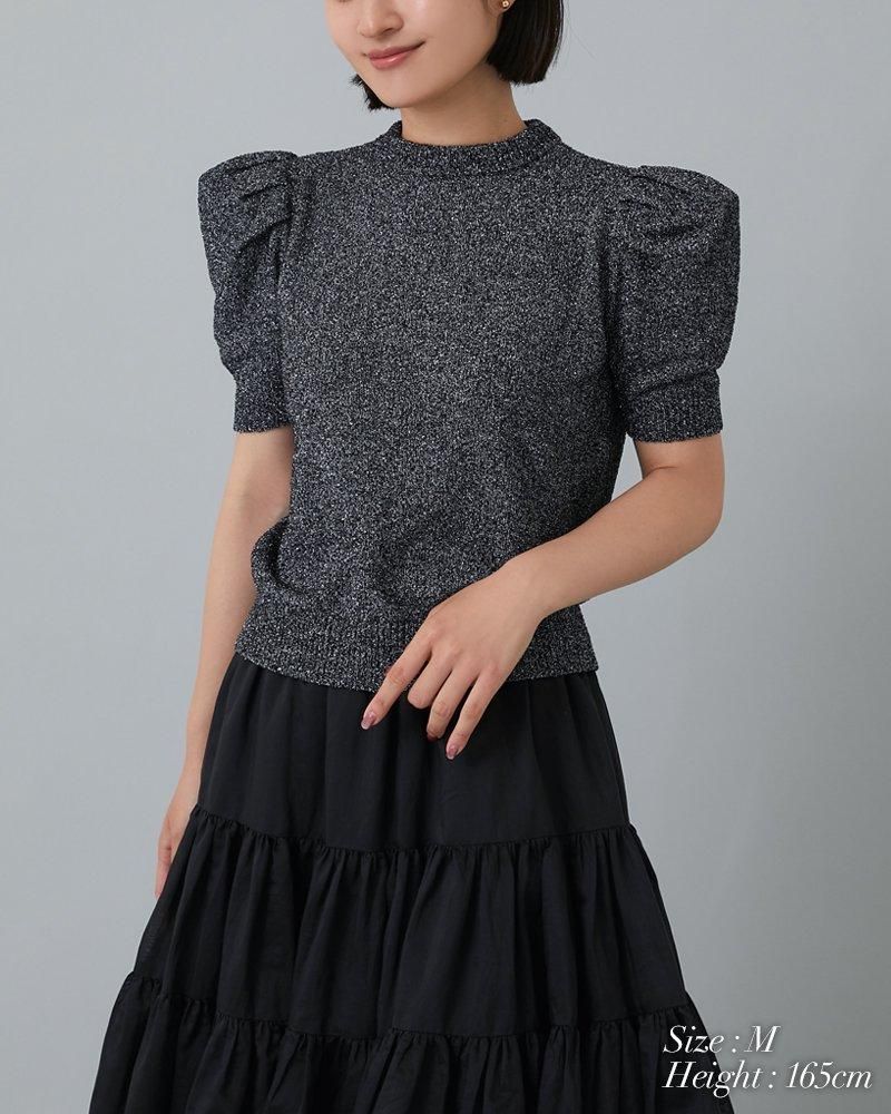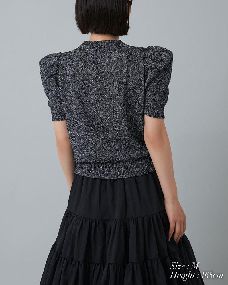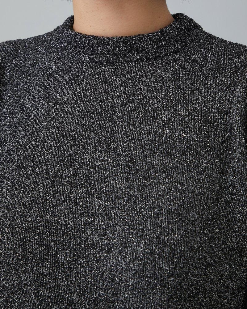 ツンとしたパワーショルダーに上品なラメが煌めくコーディネートに華やぎを添えるニット。